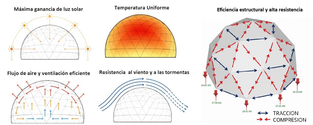 Eficiencia energética: La forma esférica del domo distribuye el calor de manera uniforme y reduce las pérdidas térmicas. Esto permite mantener una temperatura estable con menos consumo energético.